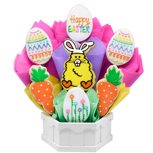 Delicious and adorable, our best-selling ‘Happy Easter’ bouquet has an unexpected visitor! Our popular ‘Chicks in Disguise’ character has snuck its way into this delectable arrangement. What a sweet surprise! Wish them a Happy Easter with an assortment of delicious, classic oversized Cookies by Design sugar cookies, hand-decorated with colorful icing. Each sugar cookie is freshly baked and expertly hand decorated with our signature icing and can be delivered safely to their doorstep or office!