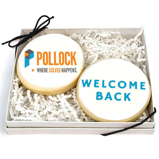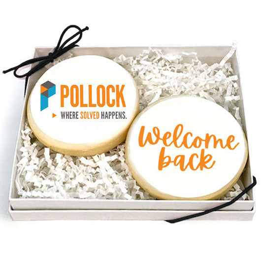Put your logo on a cookie! The two cookie Welcome Back Logo Gift Box is a wonderful way to send a truly thoughtful and personalized gift. The glossy, white gift box holds two favor-sized, freshly-baked sugar cookies. These rich, soft cookies bear your corporate logo and a welcome back message for the recipient on a velvety layer of our signature frosting. These promotional cookies are perfect for a client welcome back, business gift, employee welcome back gift, congratulations, an internal thank you or sending seasonal and holiday greetings.